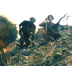 But while they were gone, I checked out some holes in the ground on a clear area directly behind Russ in this photo. Lo and behold, there were NVA in those holes and we hooked up. Russ and his crew hurriedly returned to my rescue and the battle was on. Even Col. Danford came out and got into the action.